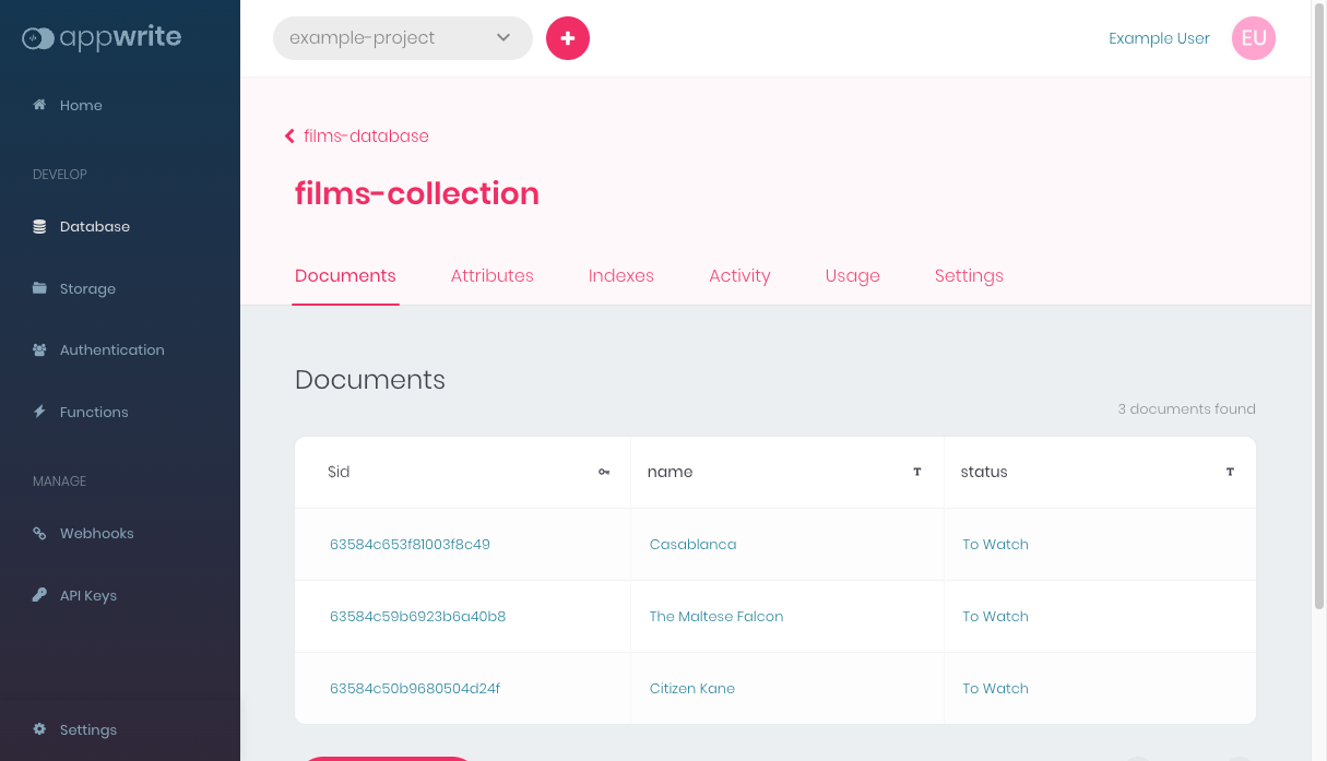 Navigate to the collection’s Documents tab and use the Add Document button to add some data. This guide assumes you have created three documents, with the names and status shown in the image below. The IDs here were automatically generated by Appwrite.